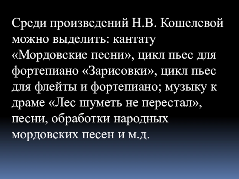 Слайд 16Среди произведений Н.В. Кошелевой можно выделить: кантату «Мордовские песни», цикл пьес