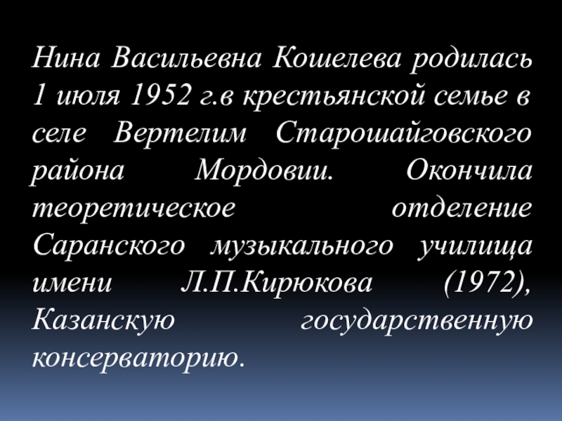 Слайд 3Нина Васильевна Кошелева родилась 1 июля 1952 г.в крестьянской семье в