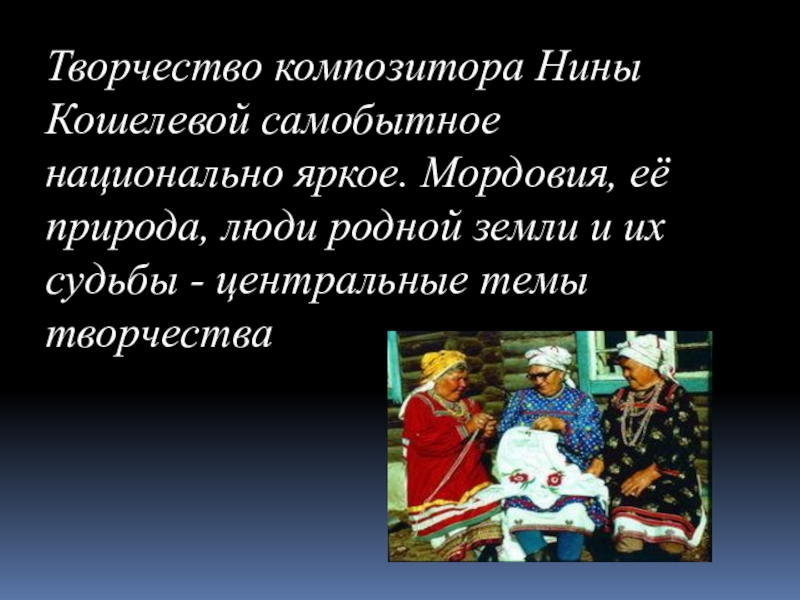 Слайд 5Творчество композитора Нины Кошелевой самобытное национально яркое. Мордовия, её природа, люди