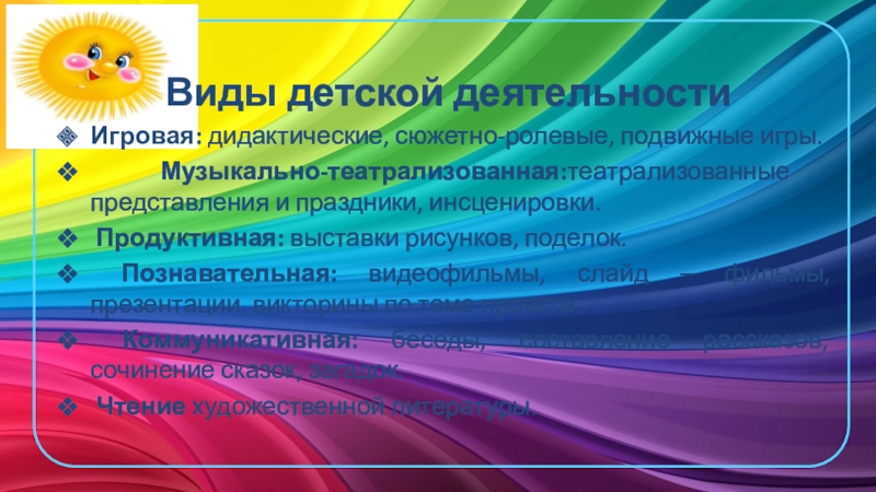 Познавательная: видеофильмы, слайд – фильмы, презентации, викторины по теме проекта.