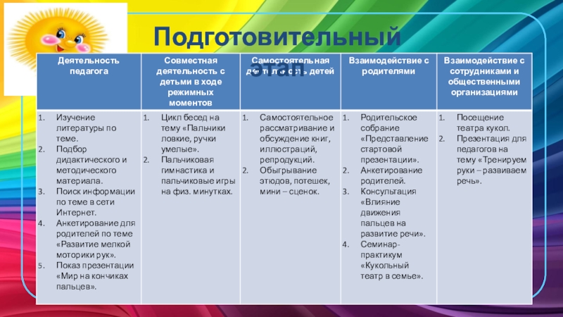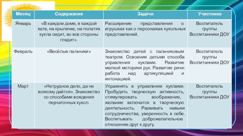 задач, сбор информации, использование компьютерных технологий, подбор художественной литературы и иллюстративного материала, заготовки кукол.