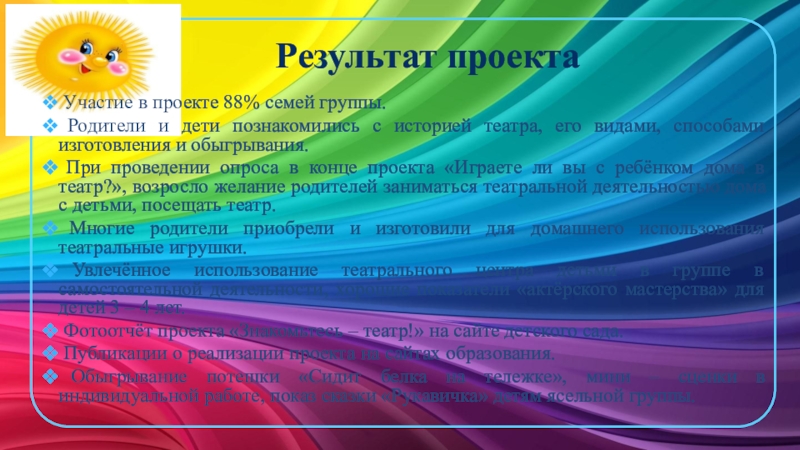 Фотоотчёт проекта «Знакомьтесь – театр!» на сайте детского сада.