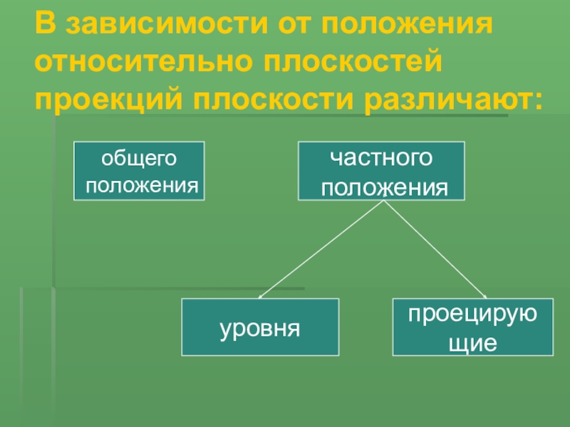 В зависимости от положения относительно плоскостей проекций плоскости различают:общего положениячастного положенияпроецирующиеуровня