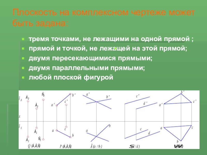 Плоскость на комплексном чертеже может быть задана:тремя точками, не лежащими на одной прямой ;прямой и точкой, не
