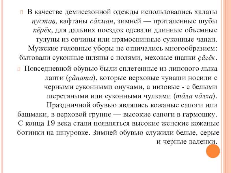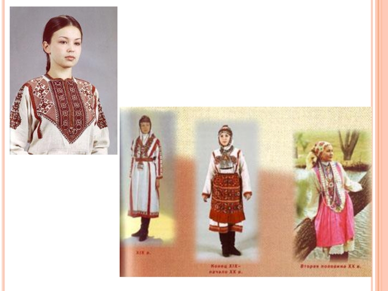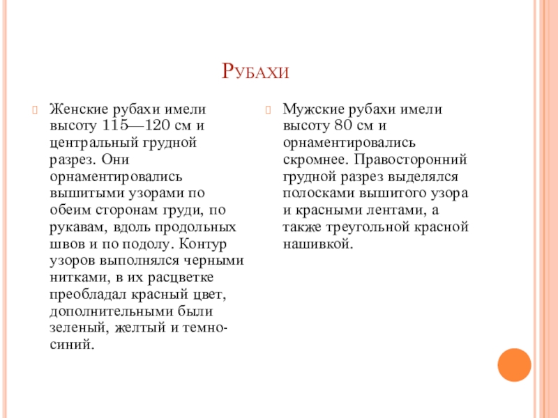 Мужские рубахи имели высоту 80 см и орнаментировались скромнее. Правосторонний грудной разрез выделялся полосками вышитого узора и красными лентами, а также треугольной красной нашивкой.