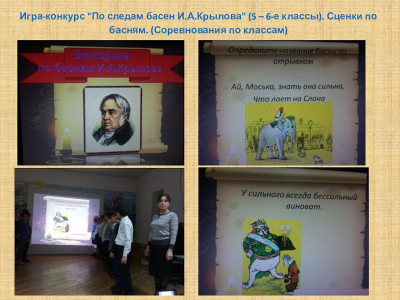 Слайд 13Игра-конкурс "По следам басен И.А.Крылова" (5 – 6-е классы). Сценки по