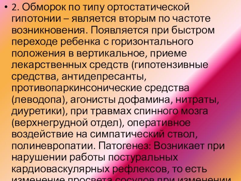 возникновения. Появляется при быстром переходе ребенка с горизонтального положения в вертикальное, приеме лекарственных средств (гипотензивные средства, антидепресанты, противопаркинсонические средства (леводопа), агонисты дофамина, нитраты, диуретики), при травмах спинного мозга (верхнегрудной отдел), оперативное воздействие на симпатический ствол, полиневропатии. Патогенез: Возникает при нарушении работы постуральных кардиоваскулярных рефлексов, то есть изменение просвета сосудов при изменении положения тела.