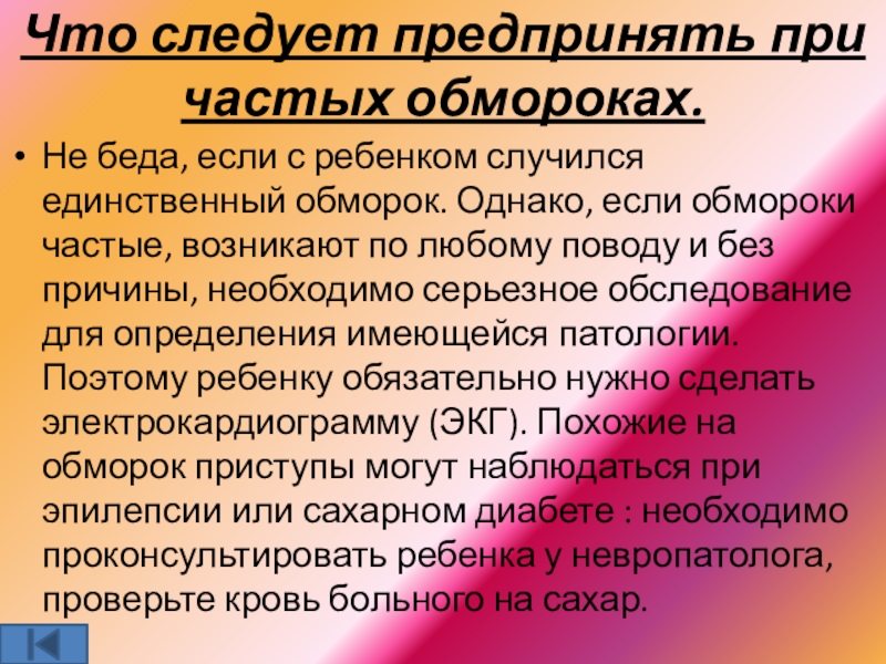 обморок. Однако, если обмороки частые, возникают по любому поводу и без причины, необходимо серьезное обследование для определения имеющейся патологии. Поэтому ребенку обязательно нужно сделать электрокардиограмму (ЭКГ). Похожие на обморок приступы могут наблюдаться при эпилепсии или сахарном диабете : необходимо проконсультировать ребенка у невропатолога, проверьте кровь больного на сахар.