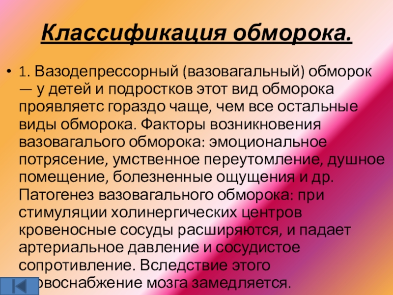 вид обморока проявляетс гораздо чаще, чем все остальные виды обморока. Факторы возникновения вазовагалього обморока: эмоциональное потрясение, умственное переутомление, душное помещение, болезненные ощущения и др. Патогенез вазовагального обморока: при стимуляции холинергических центров кровеносные сосуды расширяются, и падает артериальное давление и сосудистое сопротивление. Вследствие этого кровоснабжение мозга замедляется.