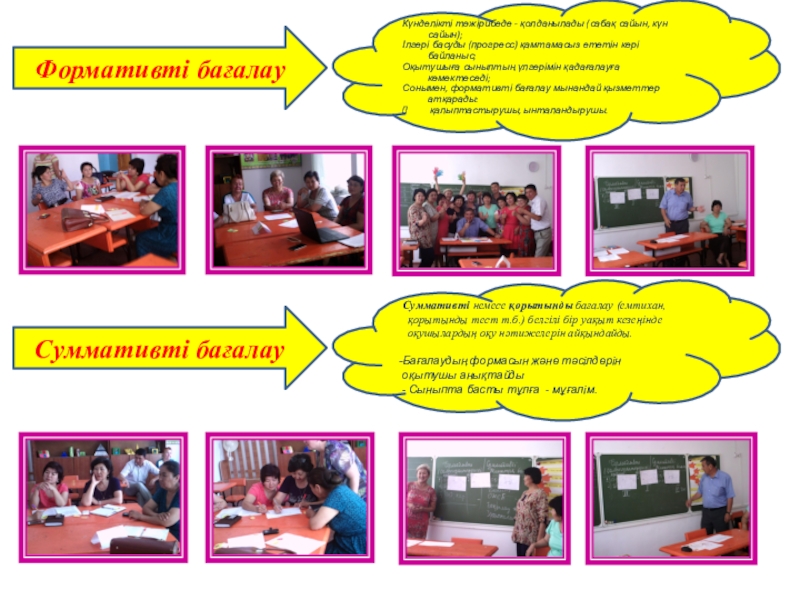 Суммативті немесе қорытынды бағалау (емтихан, қорытынды тест т.б.) белгілі бір уақыт кезеңінде оқушылардың оқу нәтижелерін айқындайды.