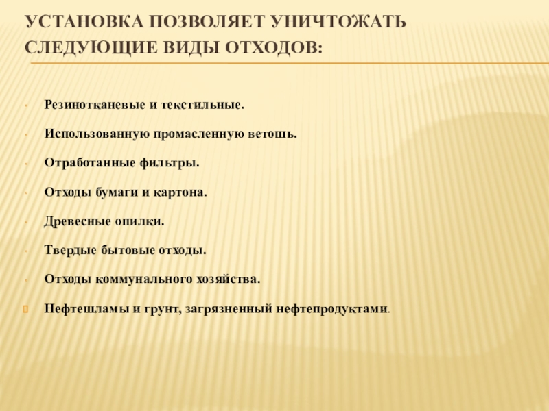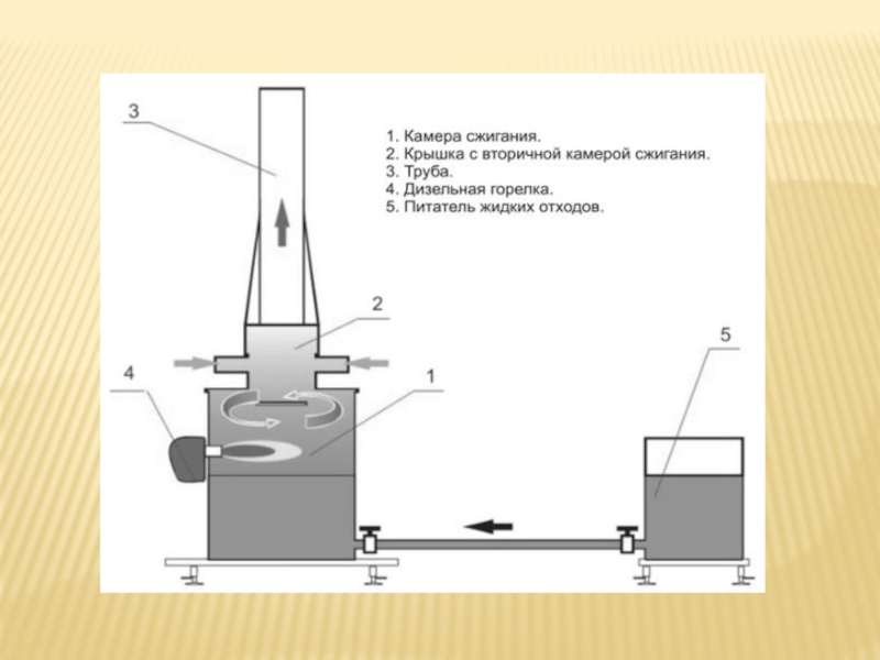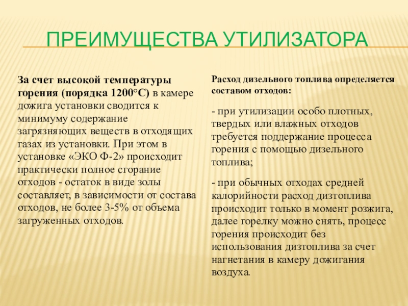 - при утилизации особо плотных, твердых или влажных отходов требуется поддержание процесса горения с помощью дизельного топлива;