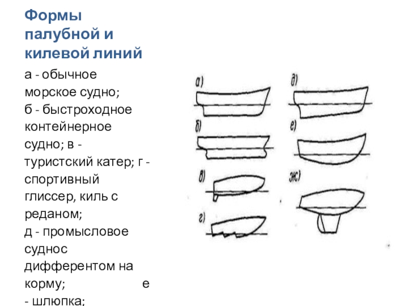 б - быстроходное контейнерное судно; в - туристский катер; г -спортивный глиссер, киль с реданом; д - промысловое суднос дифферентом на корму; е - шлюпка; ж - килевая парусная яхта.