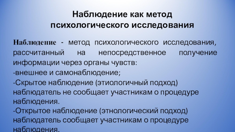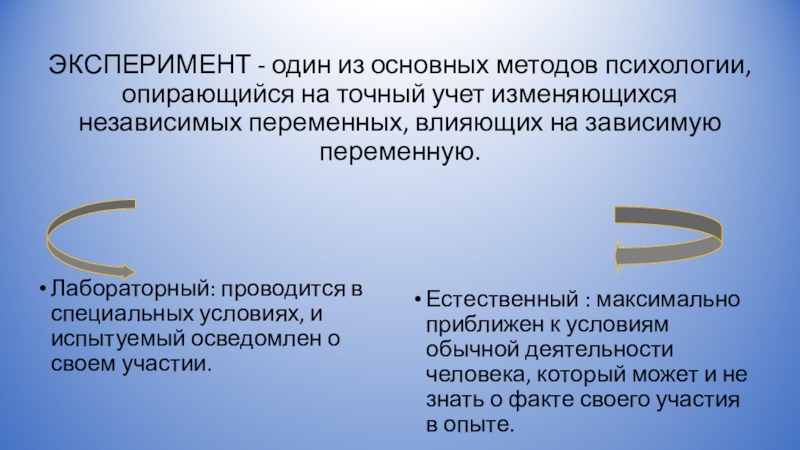 Естественный : максимально приближен к условиям обычной деятельности человека, который может и не знать о факте своего участия в опыте.