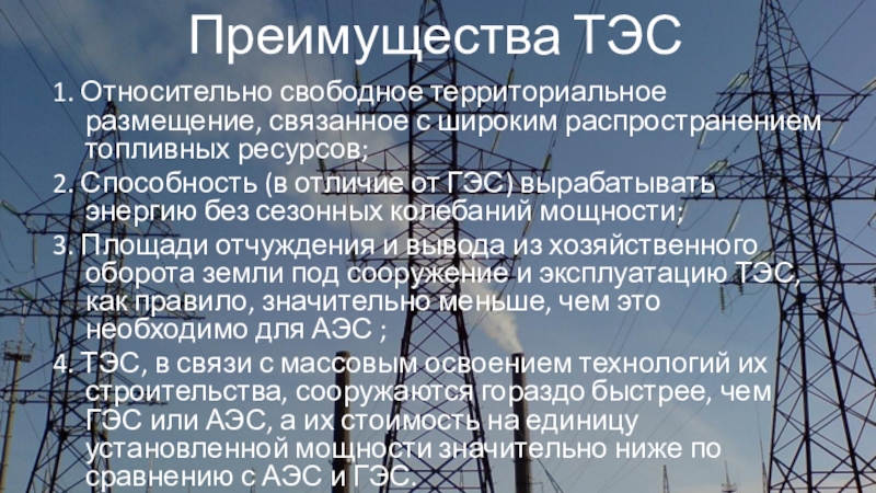 3. Площади отчуждения и вывода из хозяйственного оборота земли под сооружение и эксплуатацию ТЭС, как правило, значительно меньше, чем это необходимо для АЭС ;