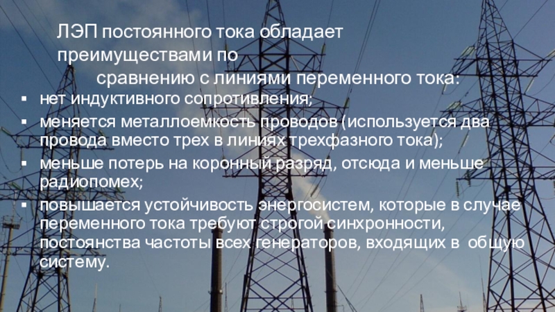 повышается устойчивость энергосистем, которые в случае переменного тока требуют строгой синхронности, постоянства частоты всех генераторов, входящих в общую систему.