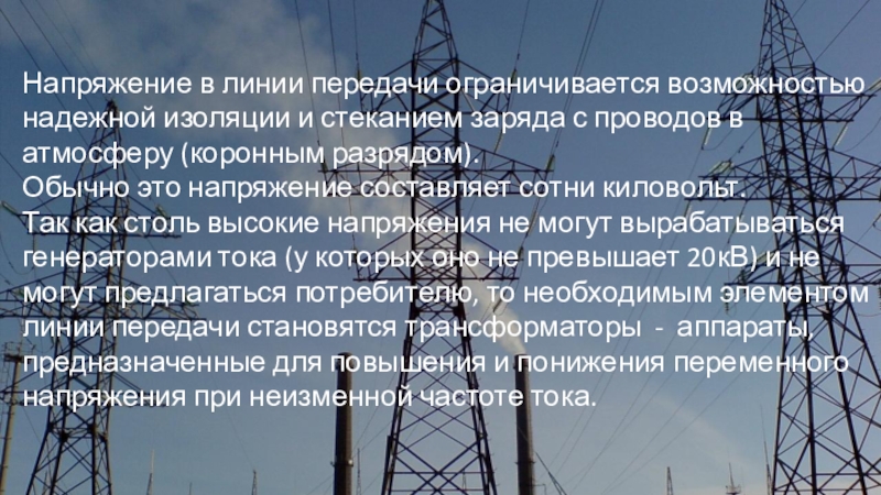 Так как столь высокие напряжения не могут вырабатываться генераторами тока (у которых оно не превышает 20кВ) и не могут предлагаться потребителю, то необходимым элементом линии передачи становятся трансформаторы - аппараты, предназначенные для повышения и понижения переменного напряжения при неизменной частоте тока.