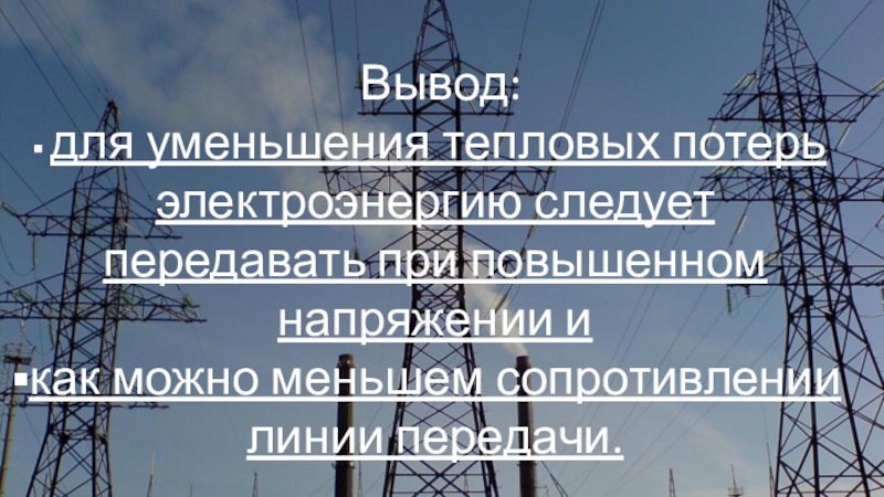 для уменьшения тепловых потерь электроэнергию следует передавать при
