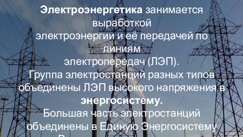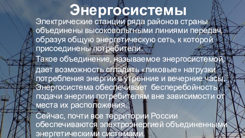 Сейчас, почти все территории России обеспечиваются электроэнергией объединенными энергетическими системами.