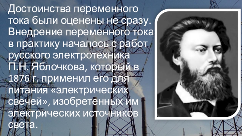 Слайд 42Переменный ток подходил для этого лучше, чем постоянный, так как мог