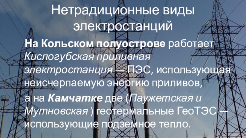 а на Камчатке две (Паужетская и Мутновская ) геотермальные ГеоТЭС — использующие подземное тепло.