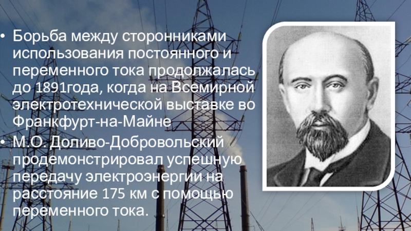 Слайд 43Борьба между сторонниками использования постоянного и переменного тока продолжалась до 1891года,