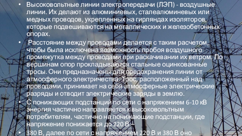 Слайд 52Высоковольтные линии электропередачи (ЛЭП) - воздушные линии. Их делают из алюминиевых,