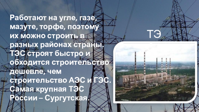 4. ТЭС, в связи с массовым освоением технологий их строительства, сооружаются гораздо быстрее, чем ГЭС или АЭС, а их стоимость на единицу установленной мощности значительно ниже по сравнению с АЭС и ГЭС.
