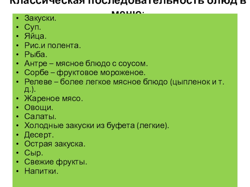 Слайд 35Классическая последовательность блюд в меню: