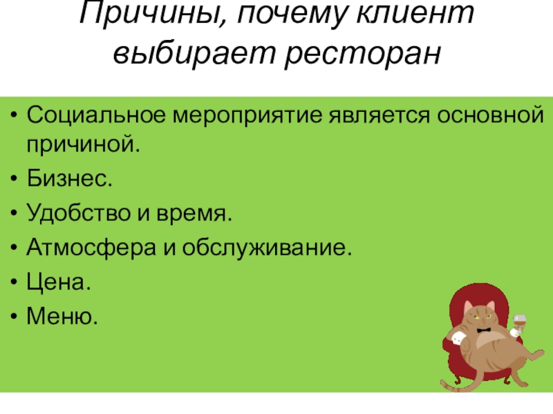 Слайд 9Причины, почему клиент выбирает ресторан