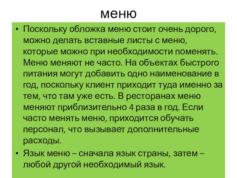 меню, которые можно при необходимости поменять. Меню меняют не часто. На объектах быстрого питания могут добавить одно наименование в год, поскольку клиент приходит туда именно за тем, что там уже есть. В ресторанах меню меняют приблизительно 4 раза в год. Если часто менять меню, приходится обучать персонал, что вызывает дополнительные расходы.