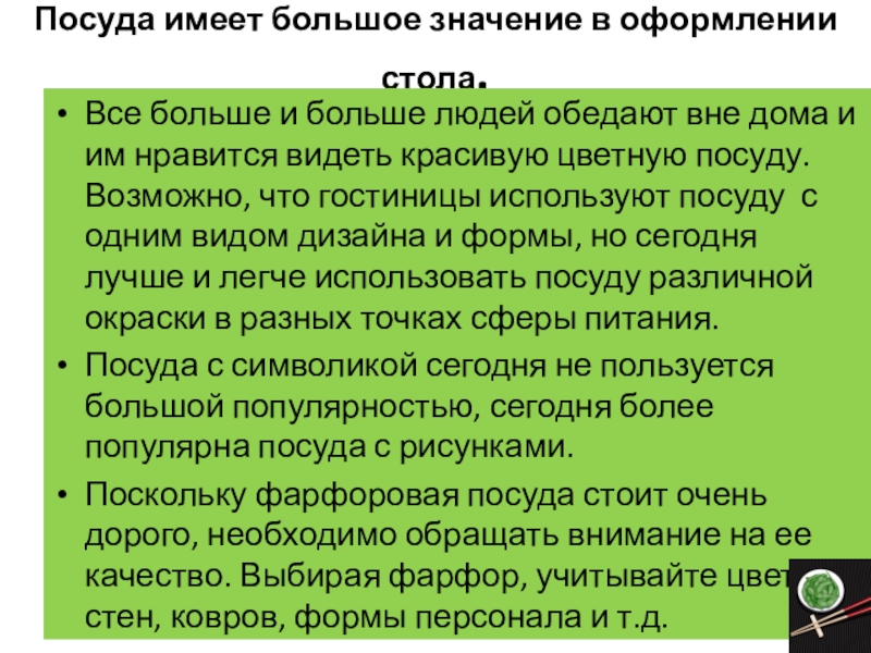 обедают вне дома и им нравится видеть красивую цветную посуду. Возможно, что гостиницы используют посуду с одним видом дизайна и формы, но сегодня лучше и легче использовать посуду различной окраски в разных точках сферы питания.