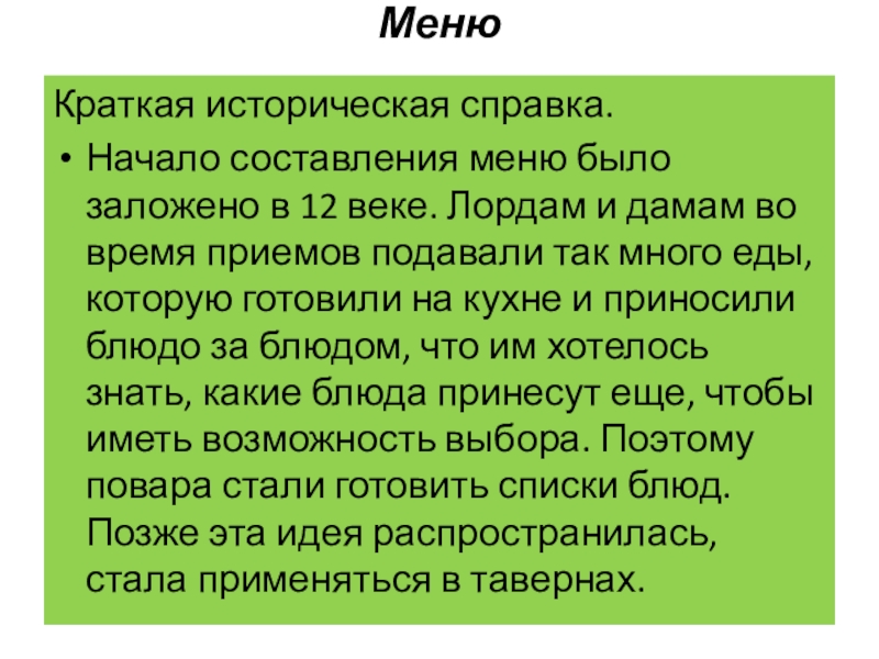 и дамам во время приемов подавали так много еды, которую готовили на кухне и приносили блюдо за блюдом, что им хотелось знать, какие блюда принесут еще, чтобы иметь возможность выбора. Поэтому повара стали готовить списки блюд. Позже эта идея распространилась, стала применяться в тавернах.