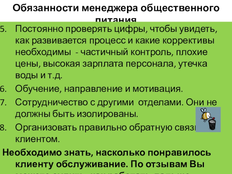 Слайд 8Обязанности менеджера общественного питания