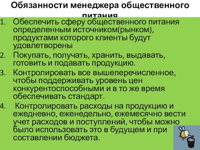 Слайд 7Обязанности менеджера общественного питания