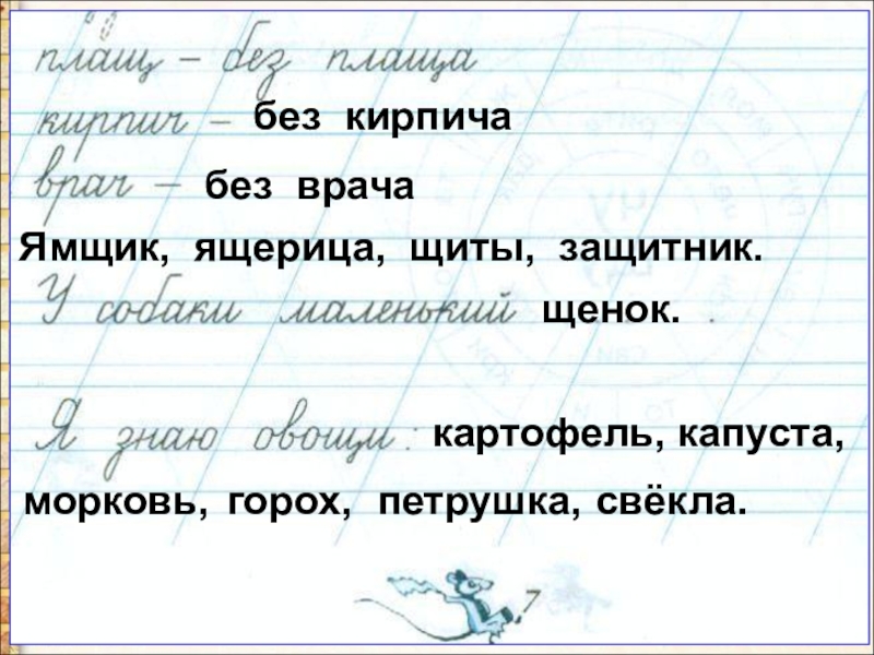 без кирпичабез врачаЯмщик, ящерица, щиты, защитник.щенок.картофель, капуста, морковь, горох, петрушка, свёкла.