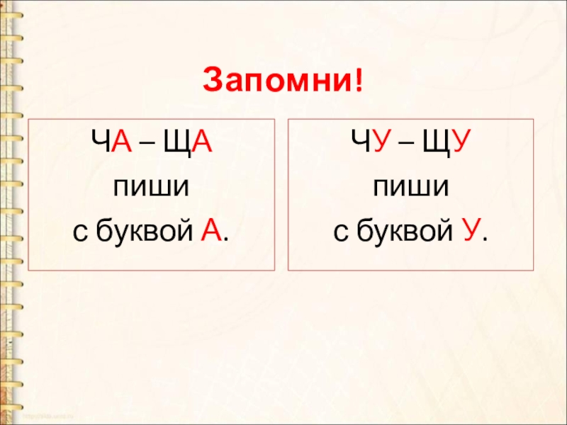 Запомни!ЧА – ЩАпишис буквой А.ЧУ – ЩУпишис буквой У.
