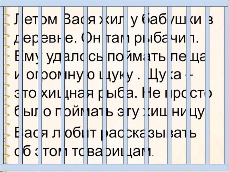 Слайд 24Летом Вася жил у бабушки в деревне. Он там рыбачил. Ему