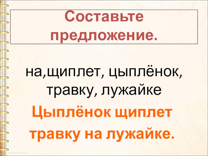 на,щиплет, цыплёнок, травку, лужайкеЦыплёнок щиплет травку на лужайке. Составьте предложение.