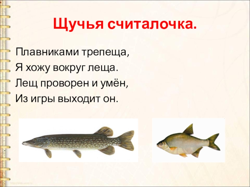 Щучья считалочка.Плавниками трепеща,Я хожу вокруг леща.Лещ проворен и умён, Из игры выходит он.