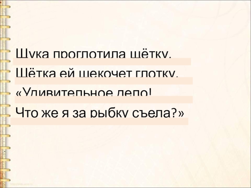 Щука проглотила щётку.Щётка ей щекочет глотку.«Удивительное дело!Что же я за рыбку съела?»
