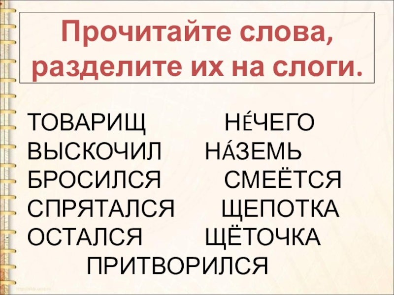 Прочитайте слова, разделите их на слоги.ТОВАРИЩ				НÉЧЕГОВЫСКОЧИЛ			НÁЗЕМЬБРОСИЛСЯ				СМЕЁТСЯСПРЯТАЛСЯ		  ЩЕПОТКАОСТАЛСЯ				ЩЁТОЧКА			ПРИТВОРИЛСЯ
