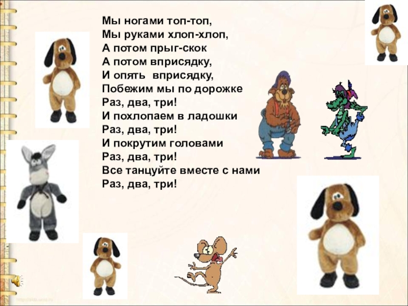 Мы ногами топ-топ,Мы руками хлоп-хлоп,А потом прыг-скокА потом вприсядку, И опять вприсядку,Побежим мы по дорожкеРаз, два, три!И