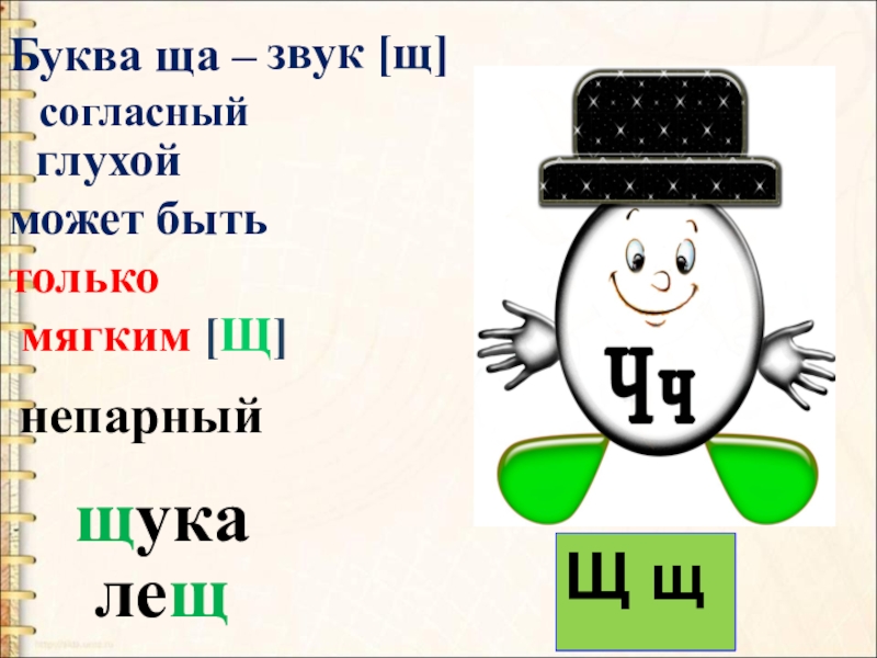 Буква ща – звук [щ] согласный   глухой может быть только мягким [Щ]щукалещЩ щнепарный
