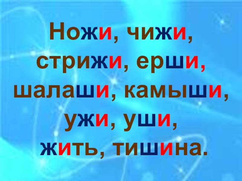 Слайд 38Ножи, чижи, стрижи, ерши, шалаши, камыши, ужи, уши, жить, тишина.