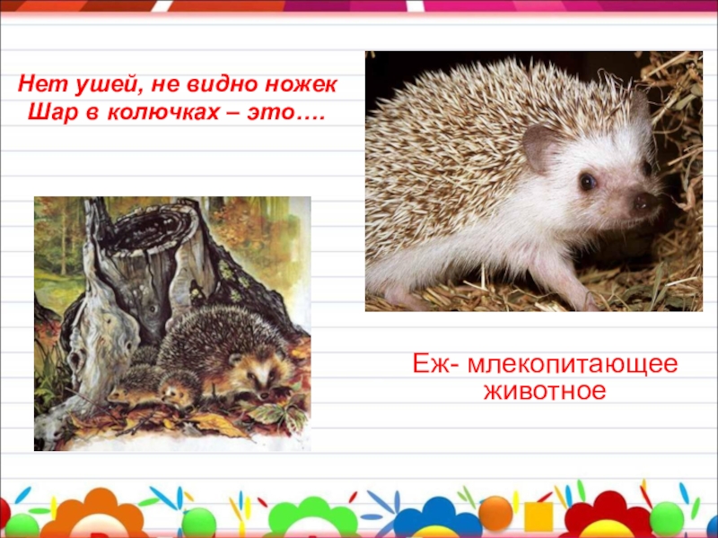 Нет ушей, не видно ножек Шар в колючках – это….Еж- млекопитающее животное