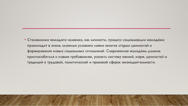 сложных условиях ломки многих старых ценностей и формирования новых социальных отношений. Современная молодёжь должна приспособиться к новым требованиям, усвоить систему знаний, норм, ценностей и традиций в трудовой, политической и правовой сферах жизнедеятельности.