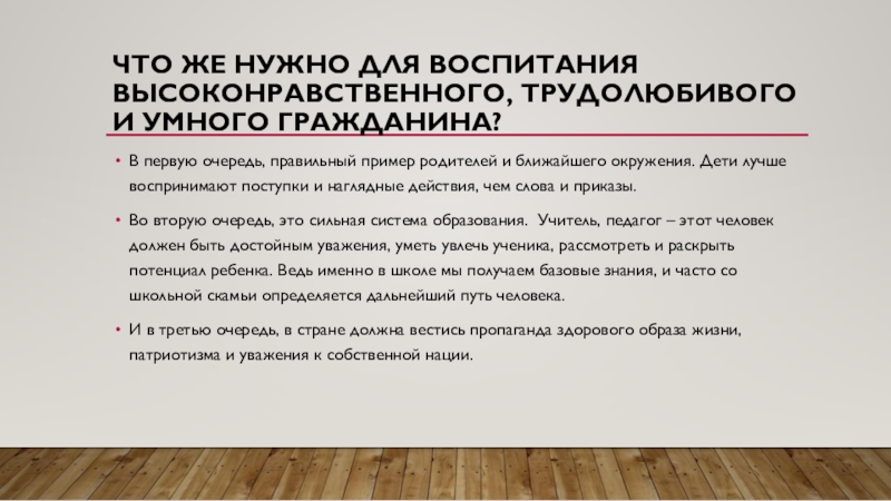 Слайд 9Что же нужно для воспитания высоконравственного, трудолюбивого и умного гражданина?