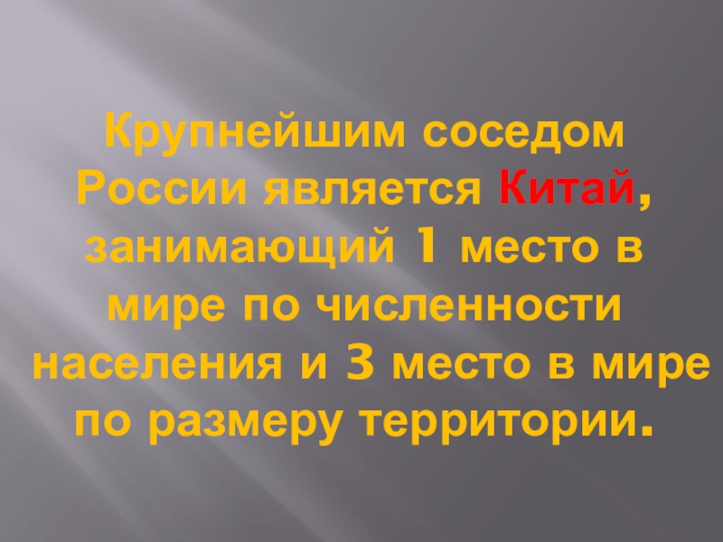 Слайд 16Крупнейшим соседом России является Китай, занимающий 1 место в мире по