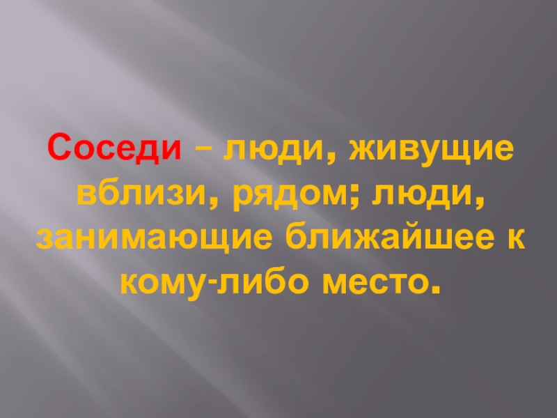 Слайд 5Соседи – люди, живущие вблизи, рядом; люди, занимающие ближайшее к кому-либо