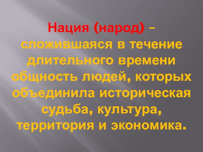 Нация (народ) – сложившаяся в течение длительного времени общность людей, которых объединила историческая судьба, культура, территория и